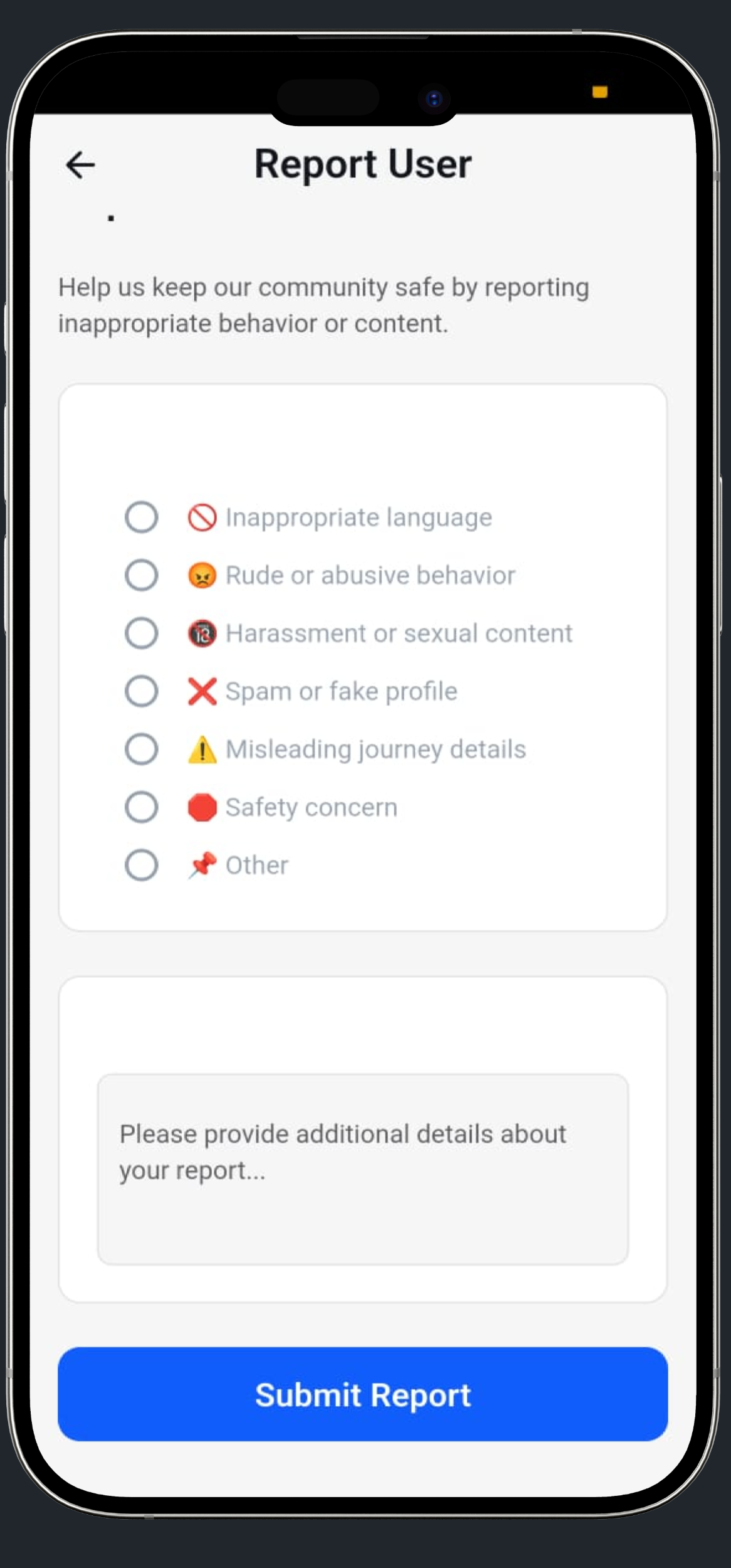 You can report users directly from the app for inappropriate behavior, spam, or safety concerns.