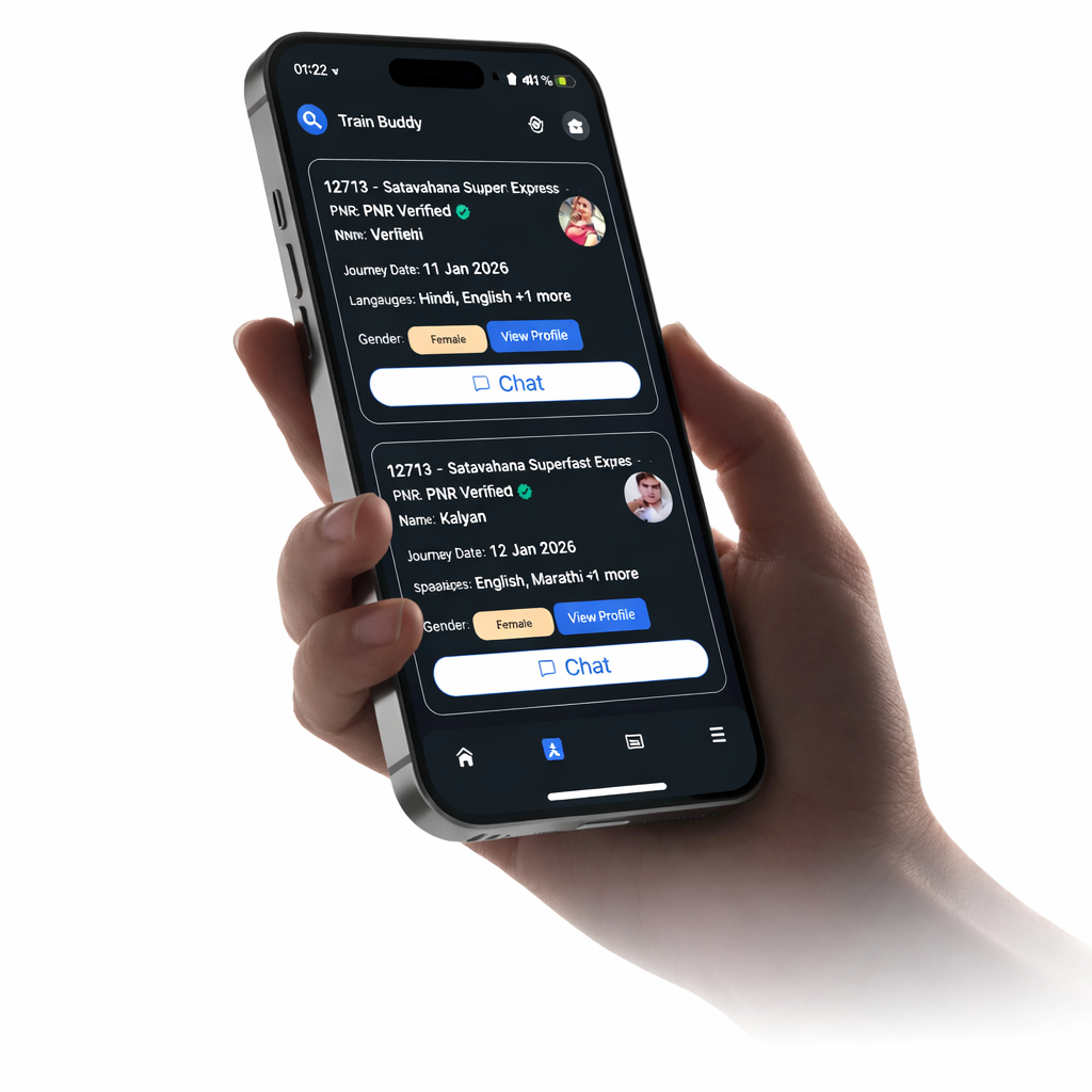 Users enter their train number and journey date to discover fellow passengers on the same train. You can view profiles and start conversations only if you’re comfortable.